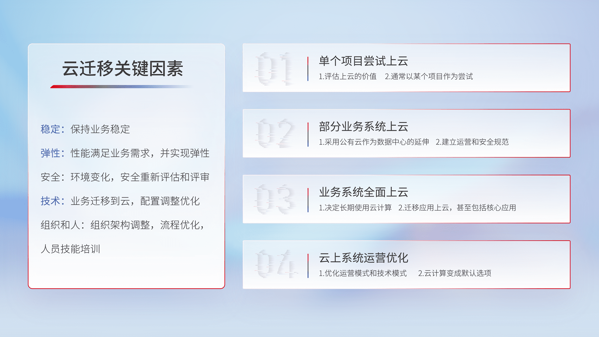 结合实际业务,,,从规划设计、、、、云平台选型、、、云原生改造、、、、数据迁移、、、集成交付,,,迁移全过程为客户识别最佳上云路径,,,,做好风险识别管理,,,设计网络架构、、、身份权限、、、、安全审计合规、、操作审计、、、、日志审计、、监控告警策略、、、、多站点容灾设计等,,对云上基础设施进行整体规划,,,提升IT治理水平,,,,以满足弹性、、高可用、、高性能的需求。。。