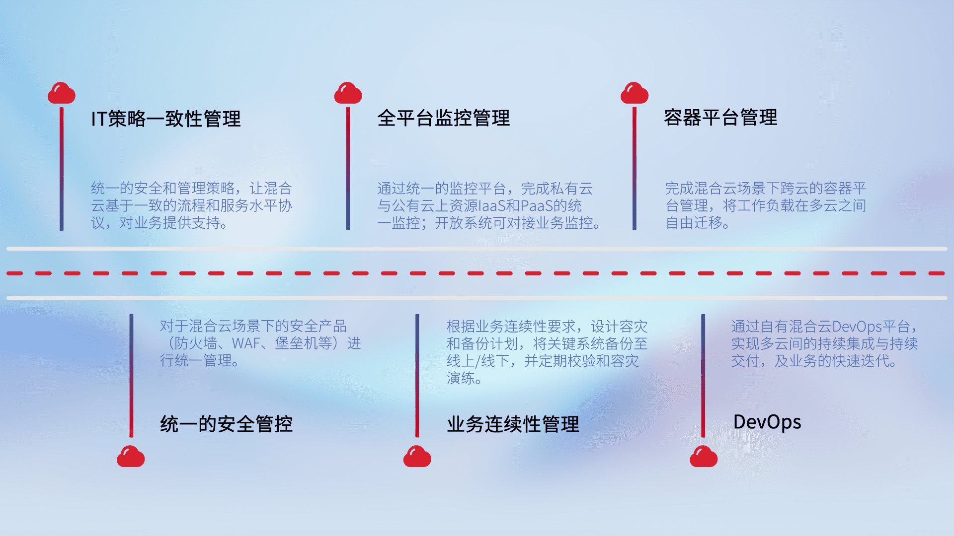 通过多云纳管,,,,以统一的资源数据模型把客户的云资源进行抽象和封装,,,进而实现对多云资源的统一操作,,,,保障云资源管理的可靠性、、、稳定性与可用性。。。量身定制化运维内容,,,配置、、开发运维、、补丁管理、、、备份、、、监控、、、认证和访问管理、、、、审计和日常巡检等,,保障在用云过程中的可靠度,,稳定度以及高可用率。。