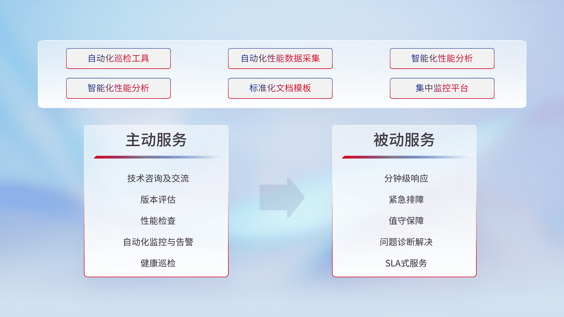 智能化工具和标准化文档,,,保障服务质量,,,提供主动服务(包含技术咨询、、、版本评估、、性能检查、、、自动化监控与告警、、健康巡检)和被动服务包含(分钟级响应、、紧急排障、、值守保障、、、问题诊断解决、、SLA服务)。。
